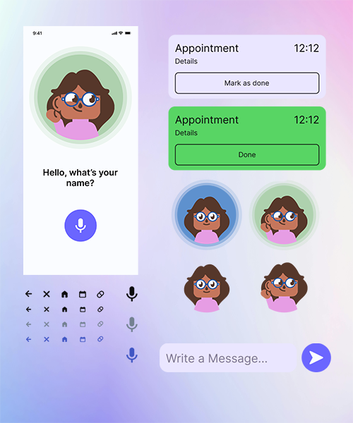 Each stage was supported by micro-interactions: Paula would ask short questions, react empathetically to emotions, and evolve her responses based on previous conversations. We also explored voice tone options, icon styles, and patterns that would feel familiar rather than futuristic.