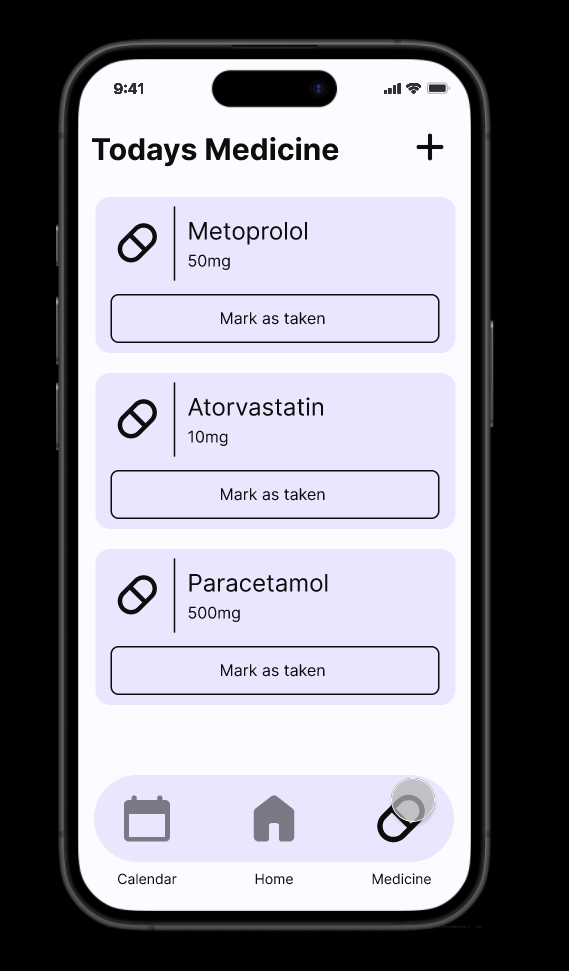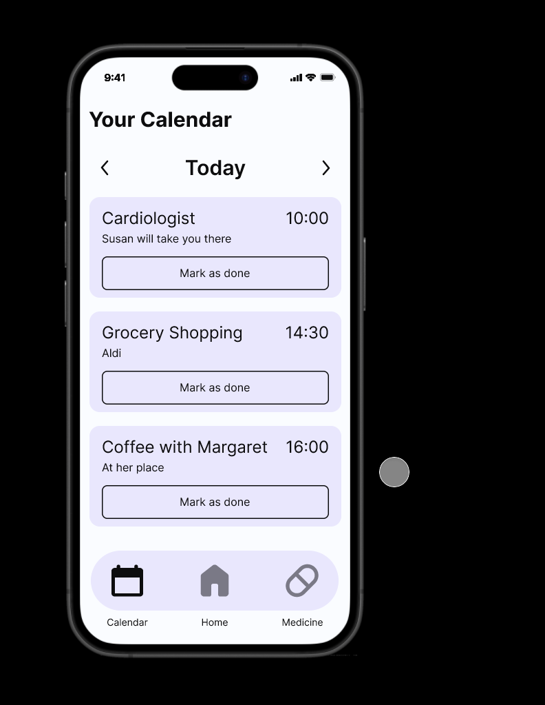 The final UI ties together emotional tone and functionality. The layout emphasizes simple flows—like confirming a medication reminder or checking today’s appointments—with high-contrast buttons and minimal screens.